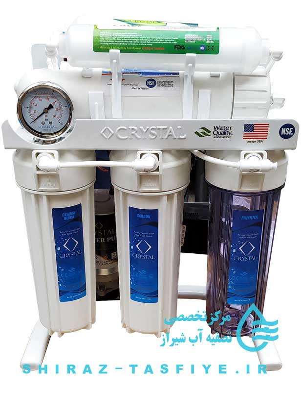 این دستگاه ، یکی از کامل ترین دستگاههای موجود در بازار ایران است که در سطح بالاتری از اغلب دستگاه های تصفیه آب مونتاژ ایران قرار دارد . مزیت های اصلی این دستگاه تمام تایوانی بودن قطعات و فیلترها و برند ثبت شده آن است که مجوز فروش و مونتاژ این دستگاه فقط در اختیار شرکت ثبت کننده آن و نمایندگان این شرکت است . اما متاسفانه دیگران نیز اقدام به مونتاژ دستگاه با همین برند می کنند که البته آنها ، برند کریستال را بصورت حک شده بر روی دستگاه و مثل تصاویر ندارند و تشخیص این دستگاهها از یکدیگر راحت می باشد . این نمونه دستگاههای تصفیه آب کریستال قیمت بسیار پایین تری دارند . در نمونه اصلی ، روی شاسی دستگاه برند CRYSTAL به صورت حک برجسته وجود دارد . نقطه ضعف این دستگاه تصفیه آب را نیز میتوان نداشتن شیر میکس و مونتاژی بودن آن دانست . فیلتر ممبران این دستگاه ، از برند SOFT WATER میباشد که ساخت تایوان بوده و کیفیت بسیار بالایی دارد . بقیه فیلترهای بکار رفته در دستگاه ، همگی بسیار با کیفیت و ساخت تایوان هستند و هیچ نقصی را نمیتوان برای آنها در نظر گرفت . فیلتر محافظ ممبران در قبل از ممبران قرار گرفته است تا از خرابی یکباره ممبران در زمان عدم تعویض به موقع فیلترها ، جلوگیری شود . مخزن استفاده شده برای این دستگاه تصفیه آب ، مخزن تانک پک 19 لیتری است TANKPAC TP19 که یکی از بهترین هاست . همچنین شرکت مونتاژ کننده این دستگاه ، دستگاه تصفیه آب دیگری نیز با برند CORODEX دارد که دقیقا این ۲ دستگاه از نظر کیفیتی مشابه با یکدیگر هستند . در کل ، اگر به دنبال یک دستگاه تصفیه آب بسیار با کیفیت هستید اما نمیخواهید پول برند و پول اضافه دهید ، این دستگاه تصفیه آب یکی از انتخاب های بسیار خوب است و اگر خواهان کیفیت بالاتر هستید باید حتما به سراغ دستگاههای وارداتی روید . چند دستگاه وارداتی با کیفیت بالا را نیز در زیر معرفی کردیم .